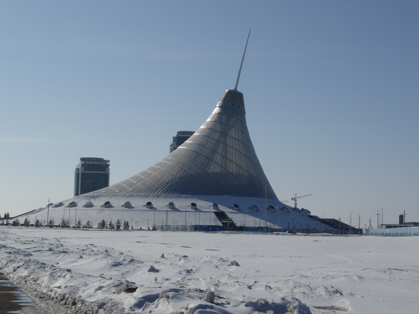 Khan Shatyr is een 150 meter hoge tent. Het beslaat een gebied van circa 140.000 vierkante meter en doet dienst als shoppigmall. Het is een bijzonder gebouw omdat er is gekozen voor speciale materialen waardoor het zonlicht wordt doorgelaten en gebruikt wordt om de temperatuur te regelen. Binnen is het altijd warm, ondanks dat het buiten ook dikwijls -35 kan worden in de wintermaanden.