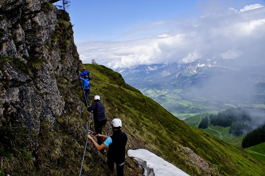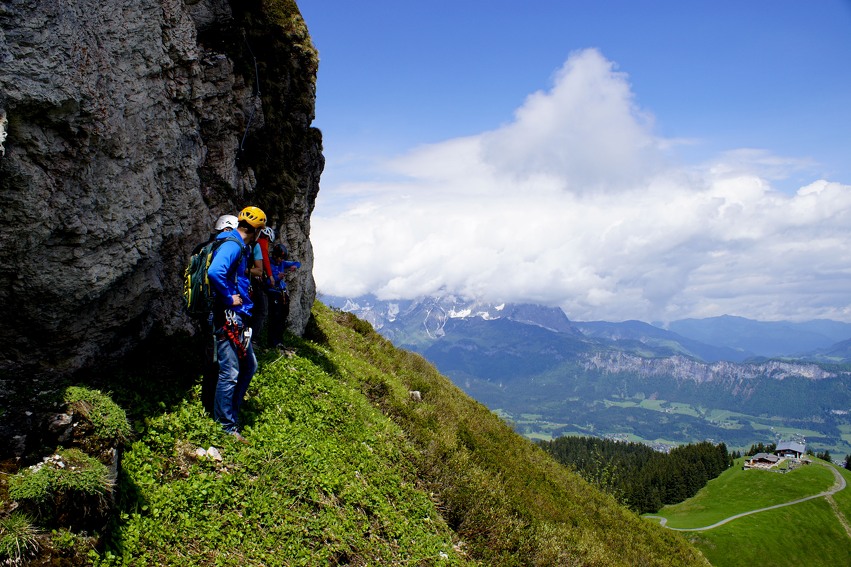 Na het oefenparcours kun je beslissen of je in staat bent een echte uitdaging aan te gaan door naar top van de Kitzbüheler Horn te klimmen. De route begint vlak bij de Ludwig-Scheibersteig, waarbij je ruim 350 meter in lengte aflegt en ruim 150 meter via de stalen kabels en langs de bergrand jezelf naar de top klimt. Deze route heeft verschillende secties met moeilijkheidsgraad C, maar wanneer je de top bereikt zal je beloond worden met het indrukwekkende uitzicht op het Großglockner. Na afloop kun je uitrusten in het restaurant terwijl je geniet van het uitzicht.